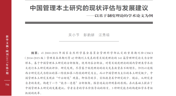 2017年第5期《新华文摘》(数字版),全文转载了365体育投注平台吴小节副教授及其指导的学术型硕士研究生彭韵妍等人合作发表于2016年第10期《管理学报》上的论文《中国管理本土研究的现状评估与发展建议——以基于制度理论的学术论文为例》,该文同时被人大报刊复印资料《管理学文摘》转载。该成果也是近10年来我校(广东工业大学为第一单位)首篇被《新华文摘》全文转载的论文。《新华文摘》作为大型理论性、综合性、资料性文摘类权威期刊,广涉千家报刊,编选了大量弘扬时代主旋律、荟萃人文学术精华、凝聚中国经验的优秀文章,为广大读者提供了大量哲学社会科学新观点、新资料、新方法和文艺佳作,以其思想性、学术性、权威性和可读性享誉海内外,是我国最具影响的哲学社会科学文摘类杂志。