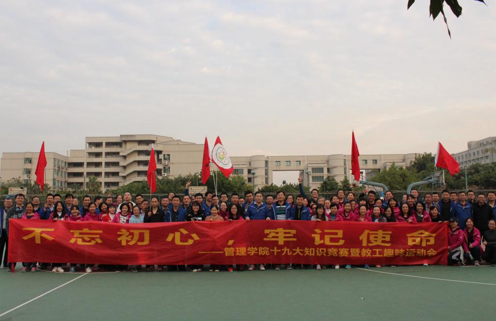 为进一步深入学习党十九大精神,丰富教职员工业余文化生活,增进教工感情与交流,凝聚学院发展力量,12月25日下午,管理学院在龙洞校区田径场举行了十九大知识竞赛暨教工趣味运动会。本次活动以“不忘初心,牢记使命”为主题,在学院部门工会的精心策划和认真组织下,学院全体170多名教职员工参加了本次活动。
