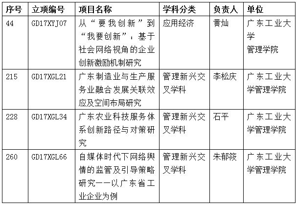 我院李松庆、石平、朱郁筱和黄灿四位老师获得广东省哲学社会科学“十三五”规划2017年度学科共建项目立项。具体见表1(管理学院立项名单)所示: