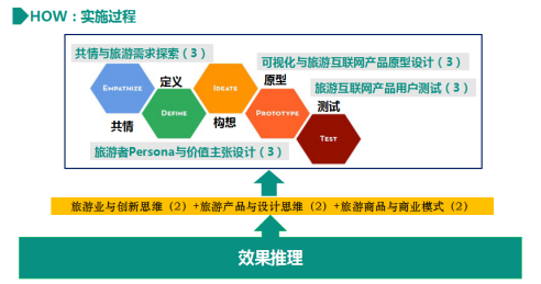 该课程响应国家双创教育的倡导,融入了国际创业教育的先进理念,并进行本土化的改进与拓展,形成了“设计思维+互联网产品设计”的体验式教学课程体系,将效果推理理论贯穿于整个课程体系的设计,基于OBE理念将教学内容、成果物、重点训练的能力与考核要求进行了逐一匹配,并最终以学生运用设计思维“创造”的旅游互联网产品作为期末考核成果物,实现了课程价值的最大化。